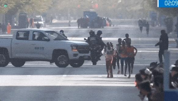 大連馬拉松,中國選手尹順金衝線時被引導車擋住去路。