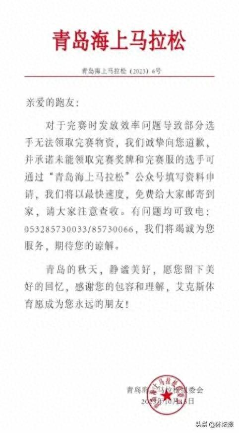 對此,賽事組委會發文致歉,表示“對於完賽時發放效率問題導致部分選手無法領取完賽物資,我們誠摯向您道歉”,並承諾未能領取完賽獎牌和完賽服的選手可通過“青島海上馬拉松”公衆號填寫資料申請。