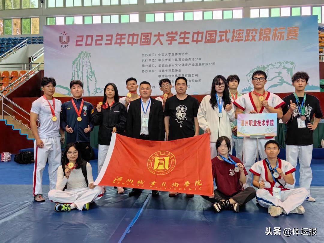10月18日—20日,2023年中國大學生中國式摔跤錦標賽在福建武夷山舉行,本次比賽共有全國45所高校約400名運動員同臺角力。我省有兩支高校隊伍參賽,其中溫州職業技術學院取得8金3銀1銅,金牌數僅次於武漢體育學院的9枚金牌。