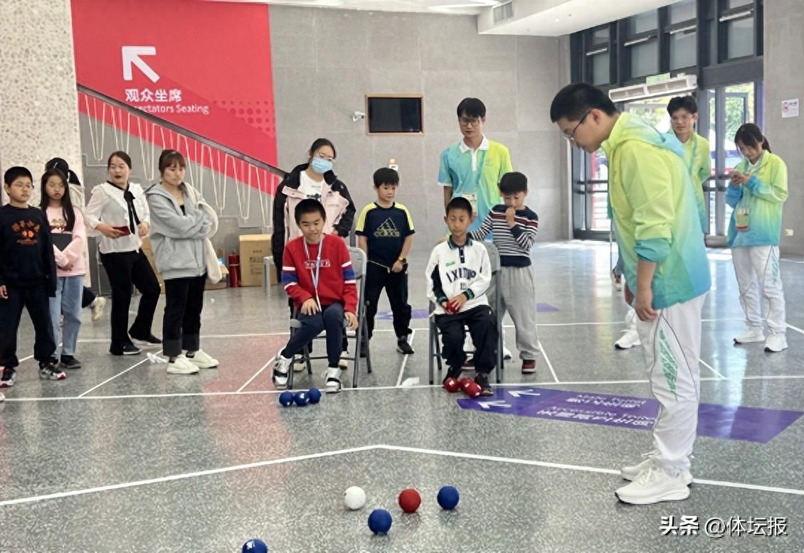 上午場的比賽結束後,觀衆入口的大廳裏卻依然熱鬧。在一塊畫了線的“球場”旁,一羣小朋友正排着隊等待體驗硬地滾球項目,幾名志願者擔任起了“裁判”,家長們站在小朋友身旁爲擲出的好球歡呼,吸引了不少觀衆駐足。