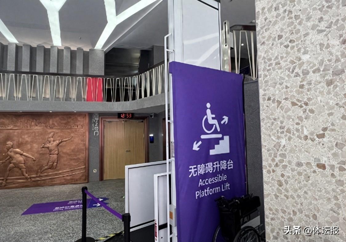 不僅是運動員流線,無障礙的關懷也體現在觀衆能接觸到的各種細節中。觀衆入口處有輪椅可供租借,臺階下有輪椅及無障礙電梯時刻“待命”;衛生間的門檻處是平滑的坡道,無障礙衛生間處處可尋……