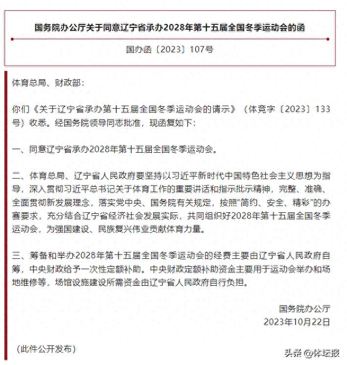 10月25日,國務院辦公廳發佈了《國務院辦公廳關於同意遼寧省承辦2028年第十五屆全國冬季運動會的函》,同意遼寧省承辦2028年第十五屆全國冬季運動會。