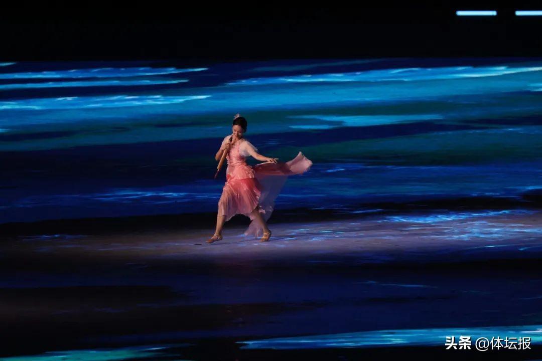 舞臺中央,深邃的藍光盡顯沉靜和安逸。一位在湖邊玩耍的少女嬉笑着漫步在裸眼3D視覺效果的青石板路上。追隨她的足跡,一片美好靈動的江南美景徐徐展現。“我要用舞蹈展現出杭州之美,同時也表達了一種對亞洲殘疾人運動員的依依不捨之情。”獨舞演員名叫汪伊美,是一位聽障姑娘。
