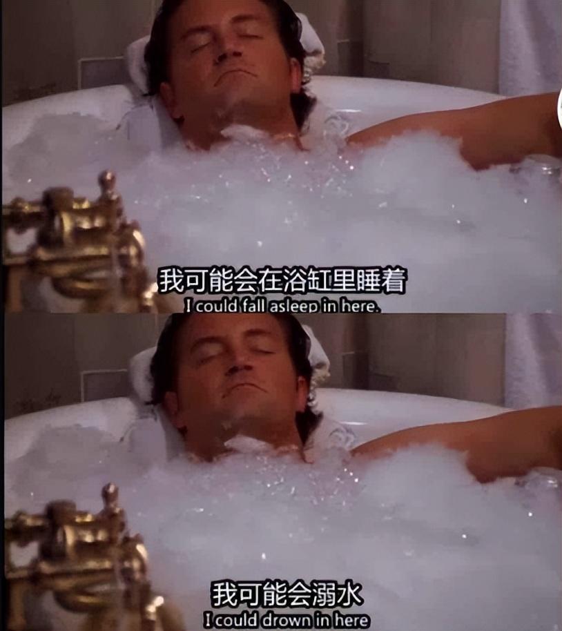 最讓粉絲神傷的是,當年拍攝《老友記》時,恰好有一幕就是錢德勒躺在自家浴缸裏的畫面,甚至連裏面的臺詞也是無比貼近現實:“我真切地感受到身上的壓力在慢慢消散,我可能會在浴缸裏睡着,我可能會溺水,慢慢身亡。”