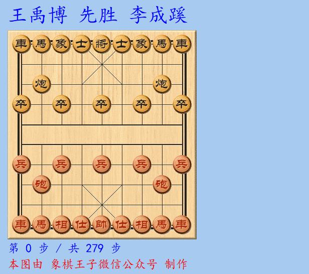 王禹博棄兵撞士,再喫黑殘士,打入279手,馬炮兵雙相對馬炮雙象,絕殺成勝,就此入局。