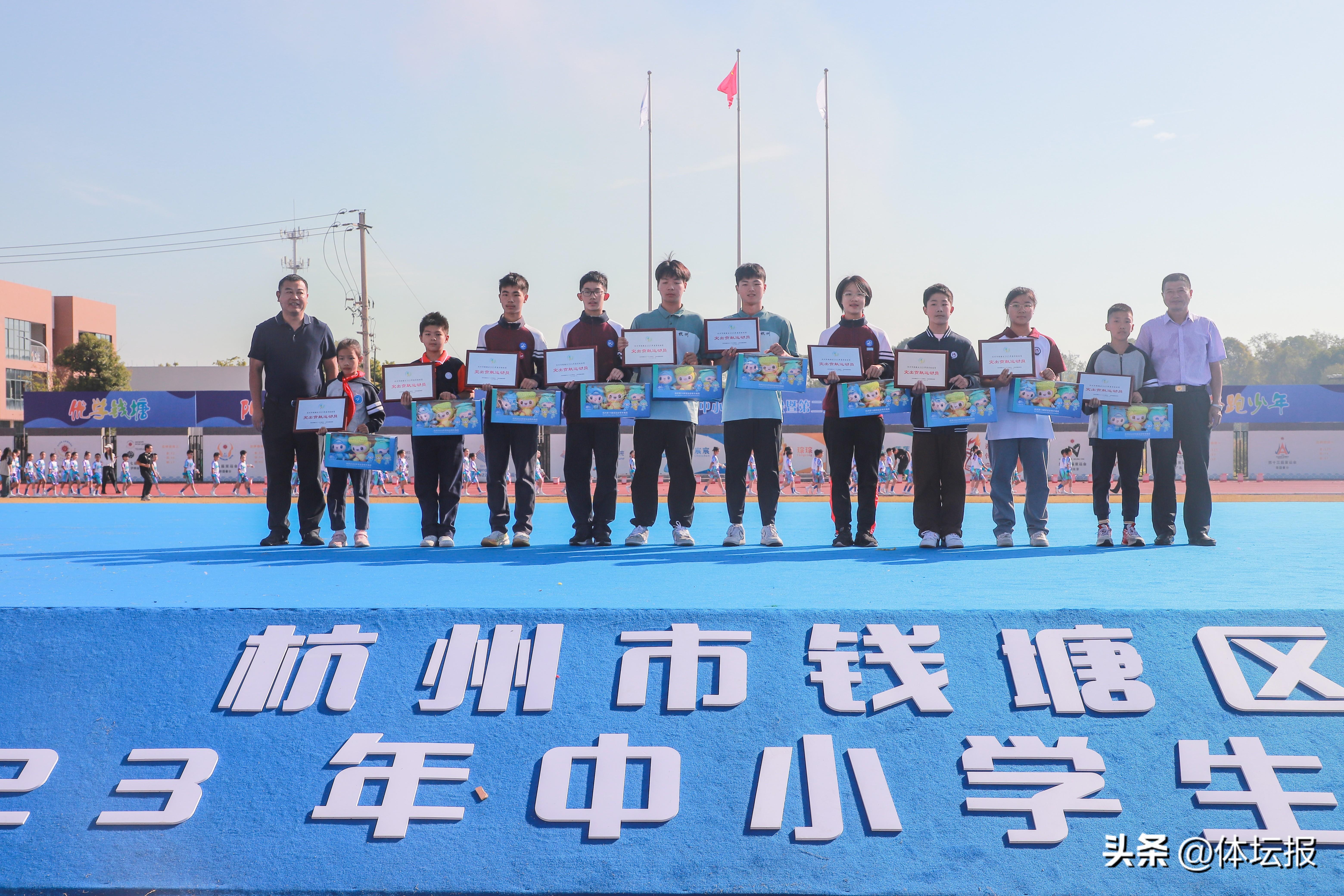 以杭州市錢塘高級中學沈慰宇爲代表的10名運動員獲得2023年度錢塘區體育突出貢獻運動員獎,以杭州市錢塘區金沙湖實驗學校陳炯鵬爲代表的10名教練員獲得2023年體育突出貢獻教練員獎,錢塘高級中學等10所學校榮獲“365健康跑”展示一等獎。