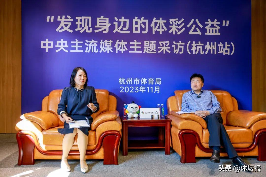 △杭州市體育局黨組成員、副局長王黎(右一)接受記者團採訪。