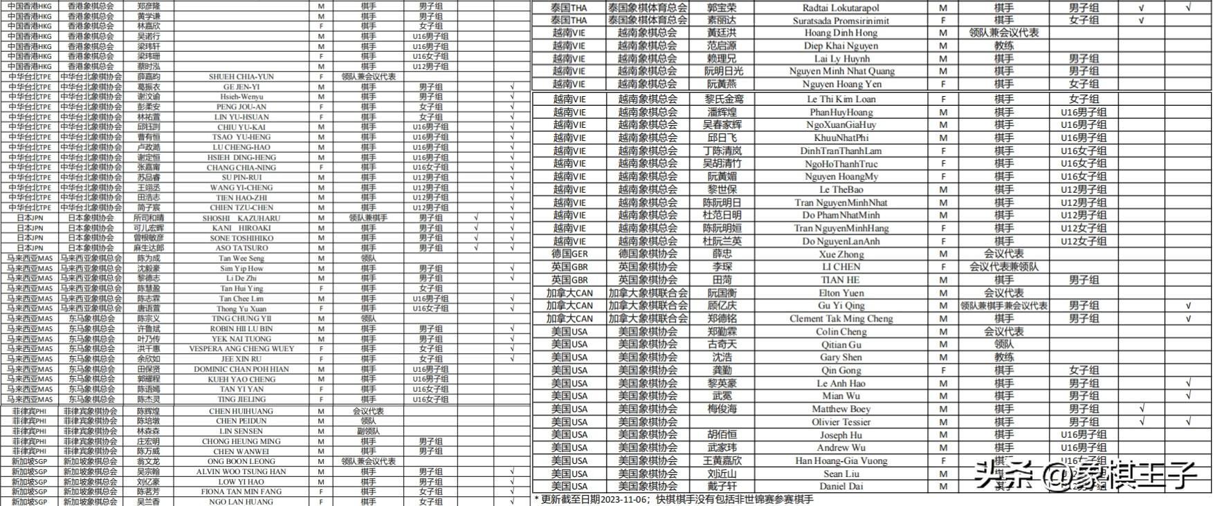 在這份第18屆世界象棋錦標賽參賽名單(公示版)[更新截至日期2023-11-06;快棋棋手沒有包括非世錦賽參賽棋手]中。