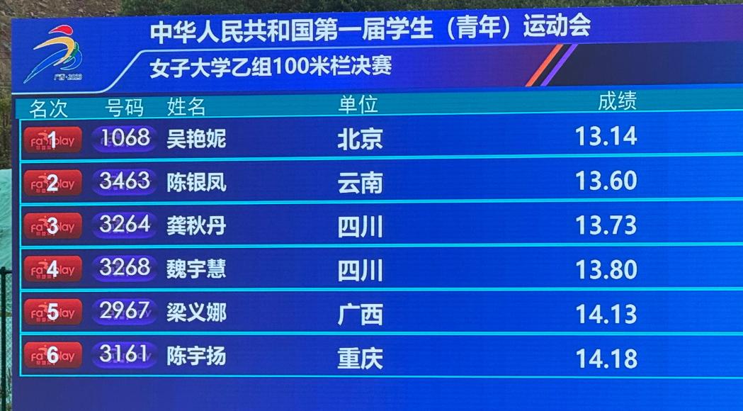 北京時間11月10日,在首屆全國學生(青年)運動會女子大學乙組100米欄決賽爭奪中,吳豔妮跑出13秒14,斬獲金牌,值得一提的是,賽前吳豔妮表示,亞運會後給自己放了一個小長假重新調整狀態,本次比賽希望成績突破13秒,但最終她沒能破13,但奪冠成績還算理想。