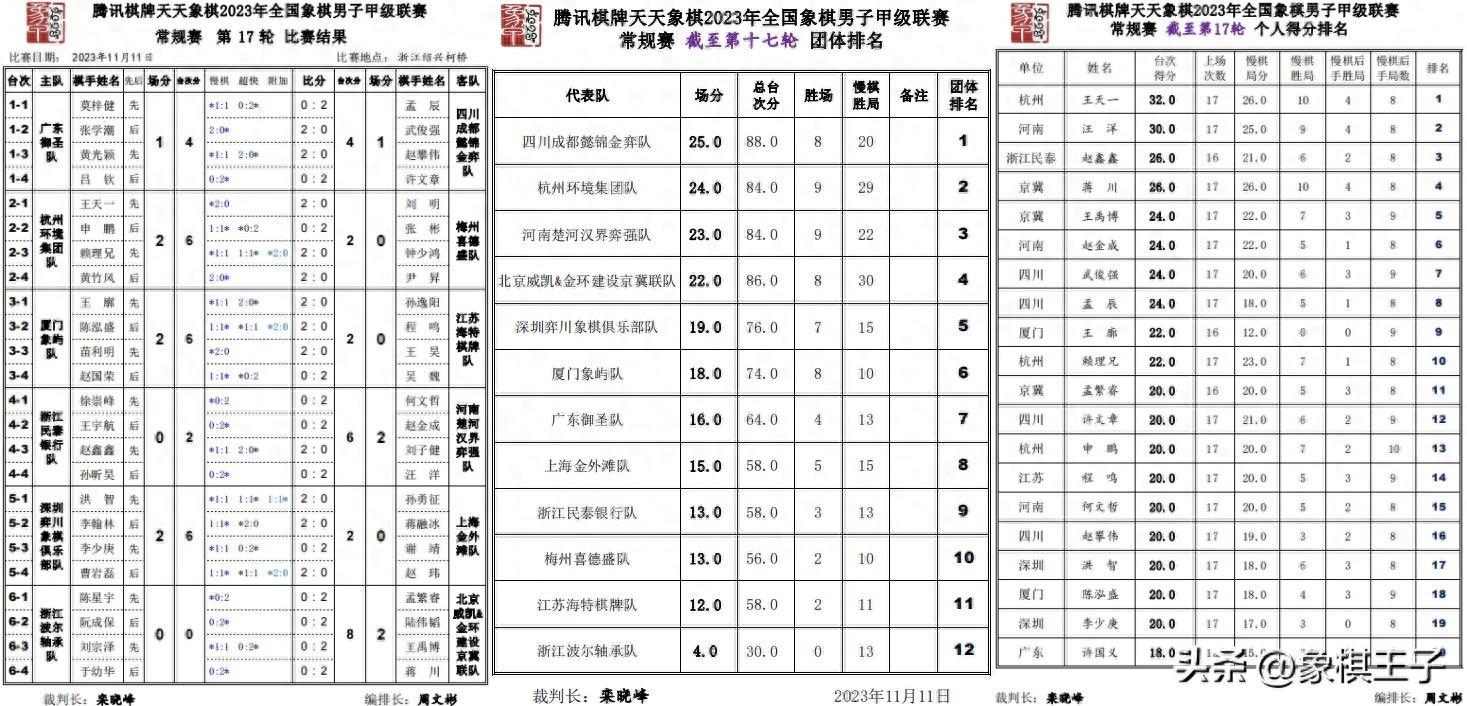 聯賽十七戰下來,四川成都懿錦金弈隊25分,杭州環境集團隊24分,河南楚河漢界弈強隊23分,北京威凱&金環建設京冀聯隊22分,四強仍是20分以上格局。