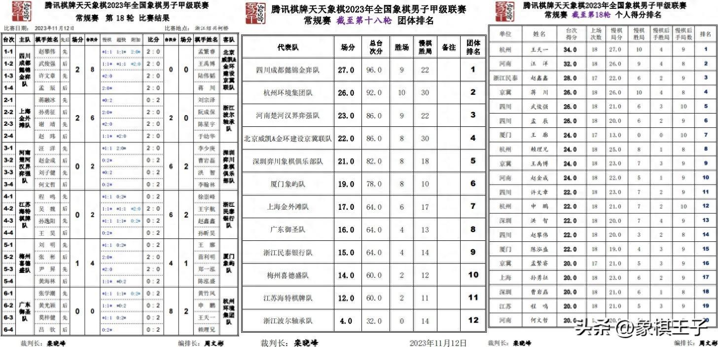 聯賽十八輪之下,四川成都懿錦金弈隊27分,杭州環境集團隊26分,河南楚河漢界弈強隊23分,北京威凱&金環建設京冀聯隊22分,深圳弈川象棋俱樂部隊21分。
