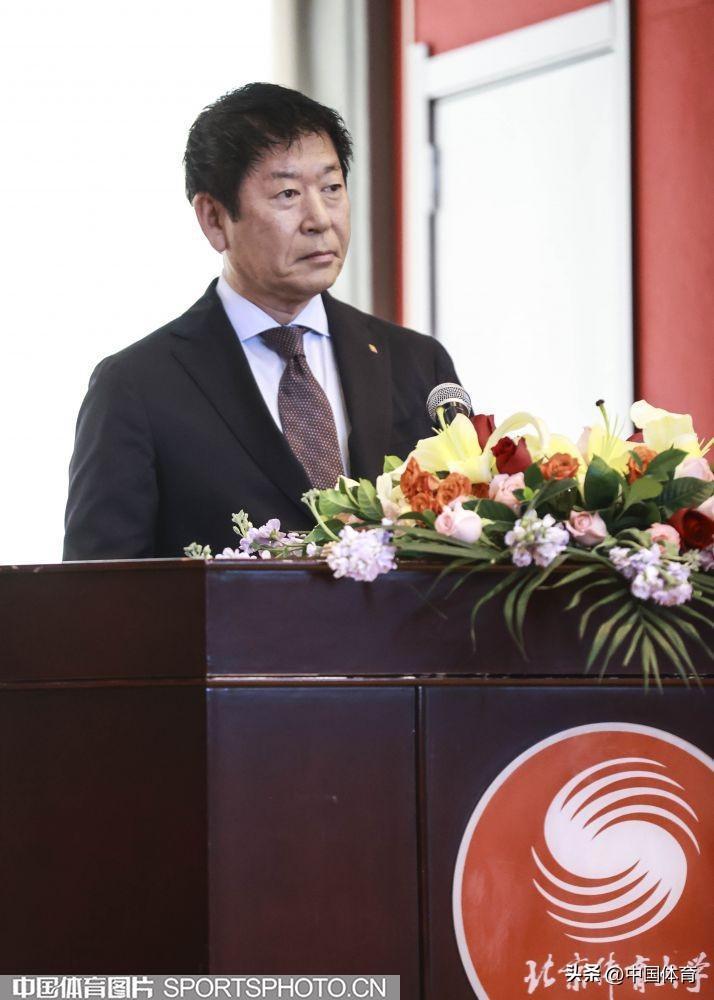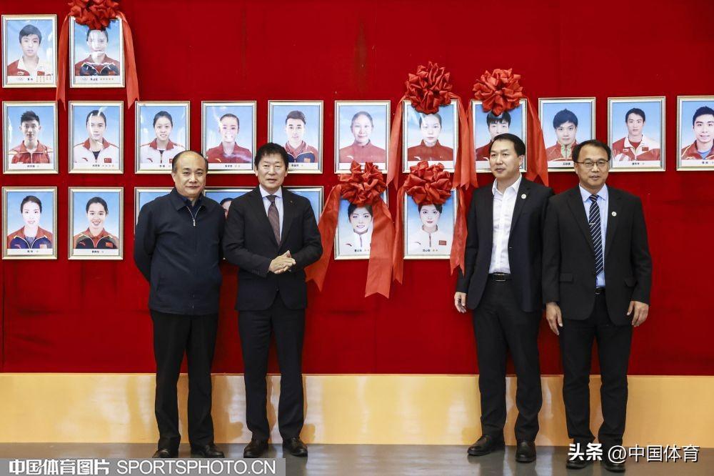 左起:北體大黨委書記曹衛東,國際體聯主席渡邊守成,總局體操中心副主任常成、袁守龍爲蹦牀世界冠軍揭榜