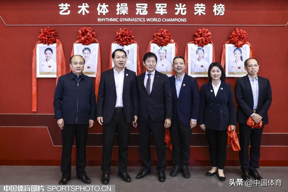 總局體操中心副主任常成(左二)、國際體聯主席渡邊守成(左三)等爲藝體世界冠軍揭榜