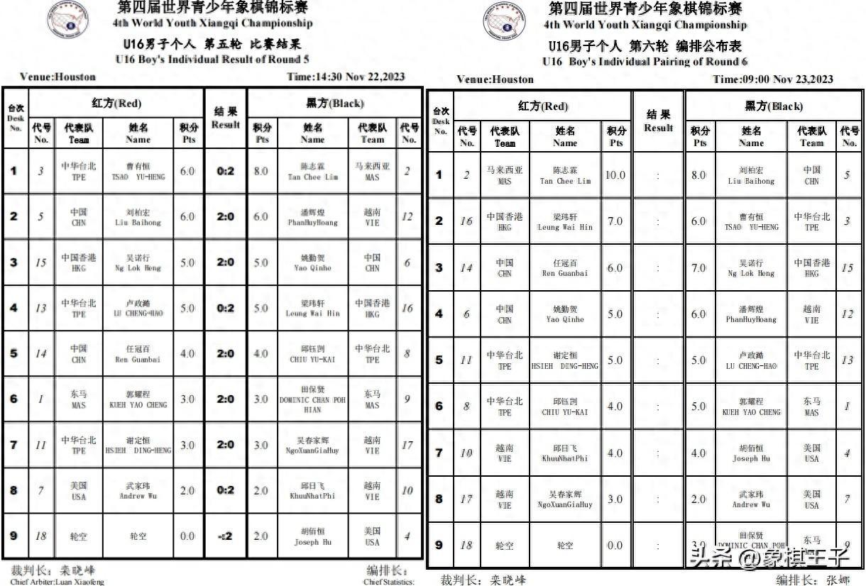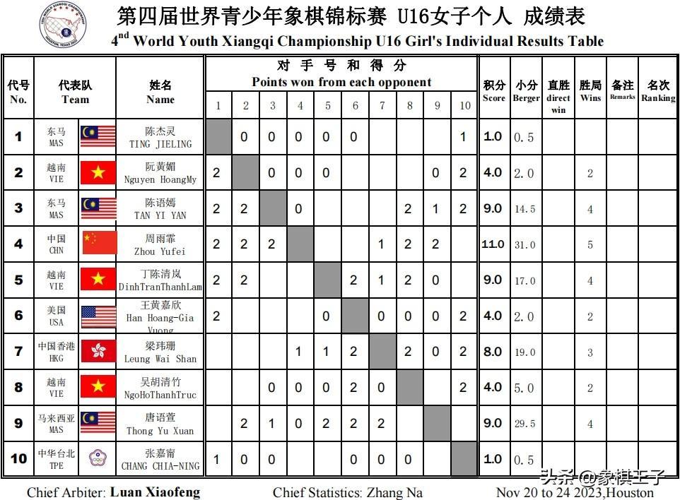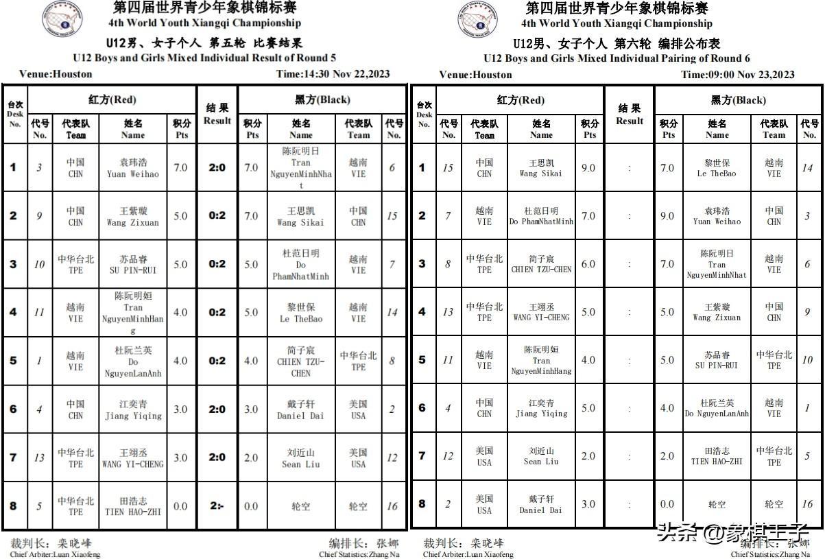 U12男+女,中國袁瑋浩、王思凱,二小將同爲9分並摯,越南三少年,黎世保、杜範日明、陳阮明日,均7分,中國王紫璇、江奕青5。