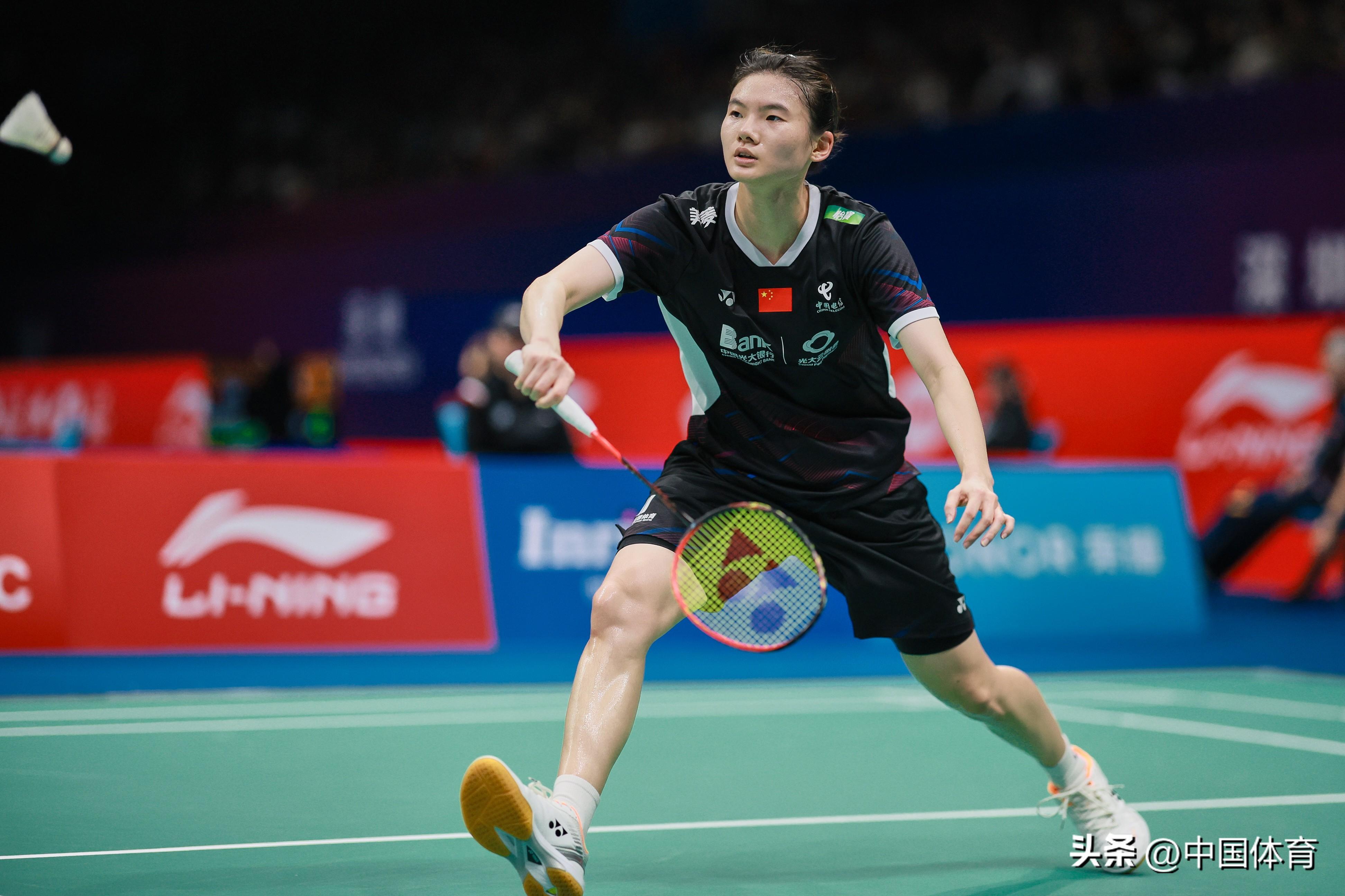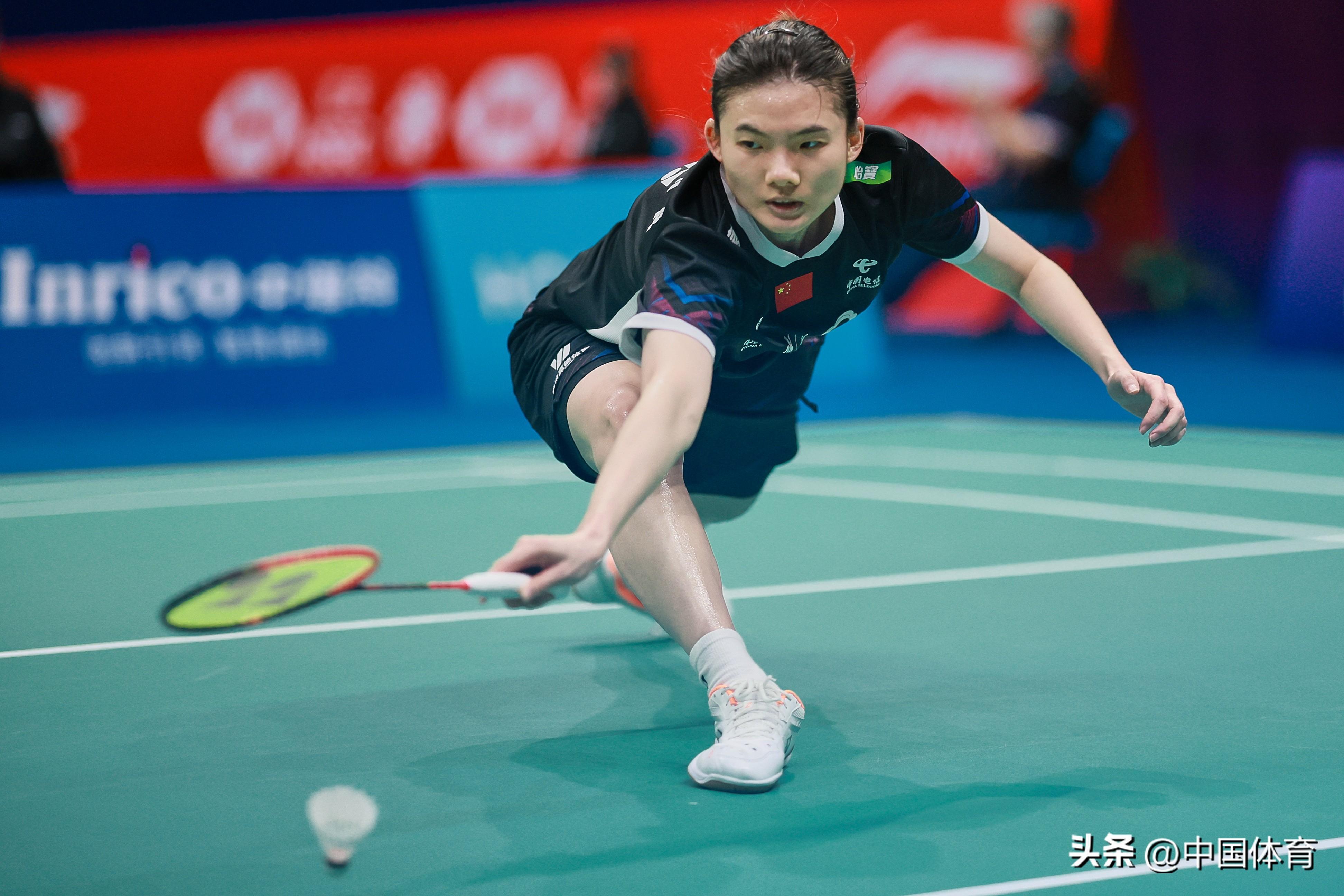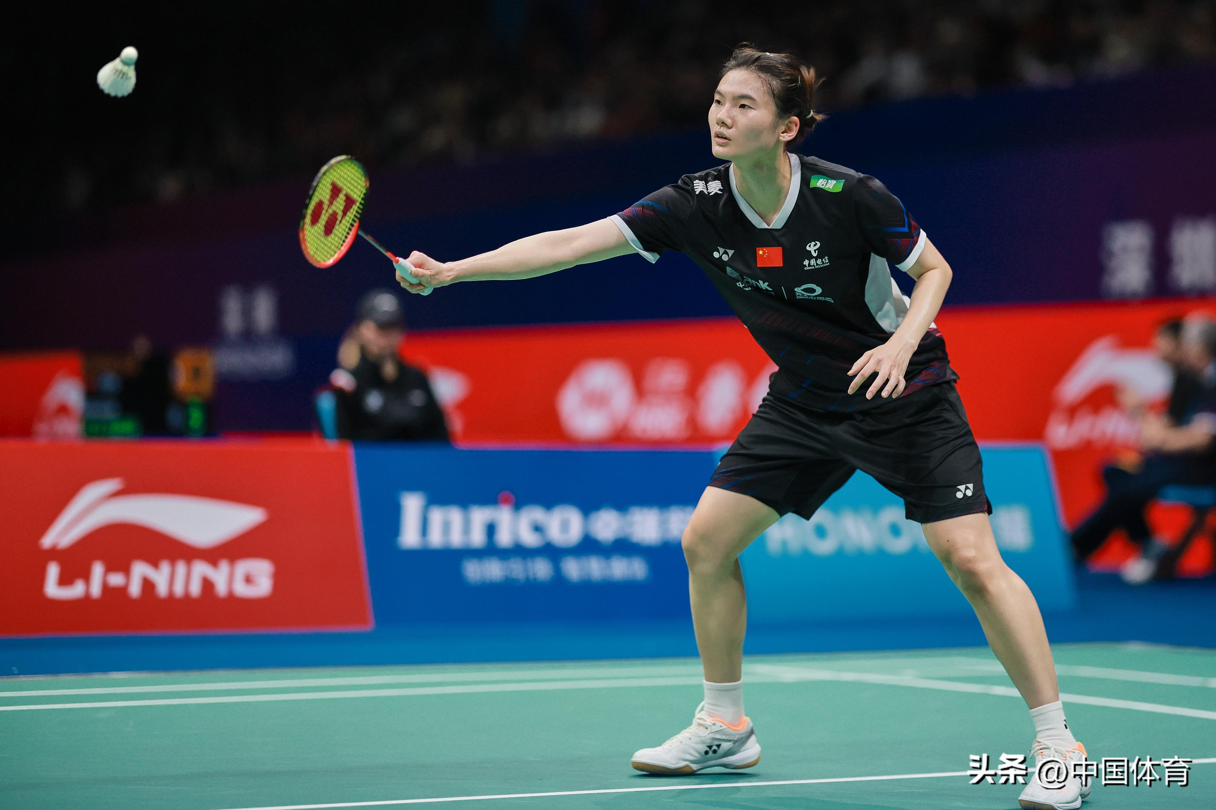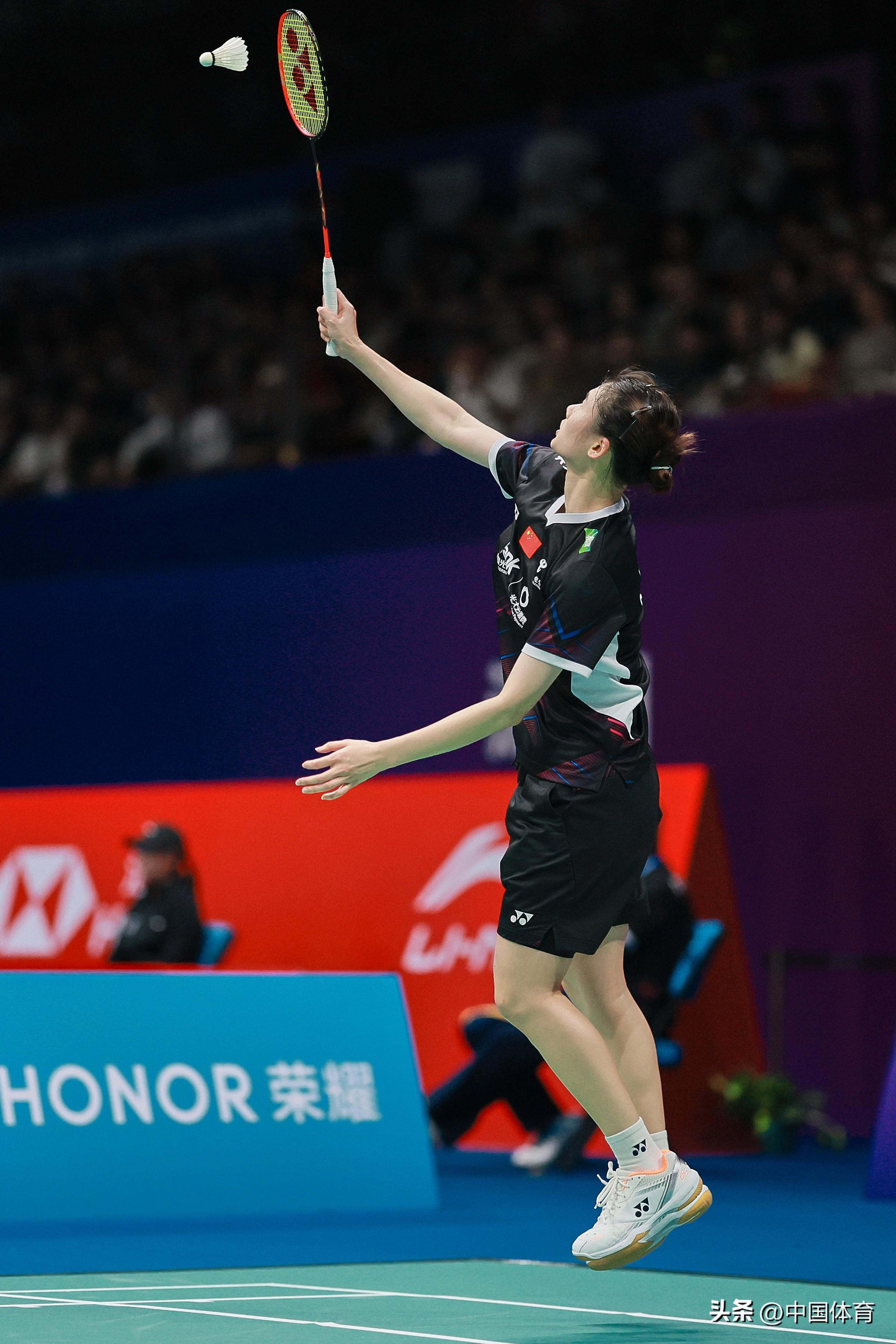 中國體育訊 11月23日,在2023中國羽毛球大師賽女單第二輪比賽中,中國選手韓悅以2比1戰勝新加坡選手楊佳敏(21比17、16比21、21比18),晉級八強。 圖爲韓悅在比賽中。(中國體育圖片 鹿麟 攝)