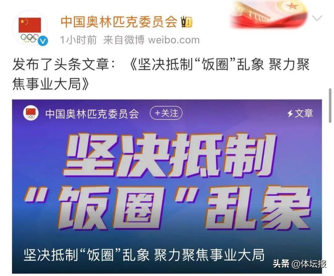 針對這近幾年在體育圈中頻頻出現的“飯圈”亂象,本週一,中國奧林匹克委員會官方微博發佈文章《堅決抵制“飯圈”亂象 聚力聚焦事業大局》,嚴正表態,堅決抵制“飯圈”亂象。