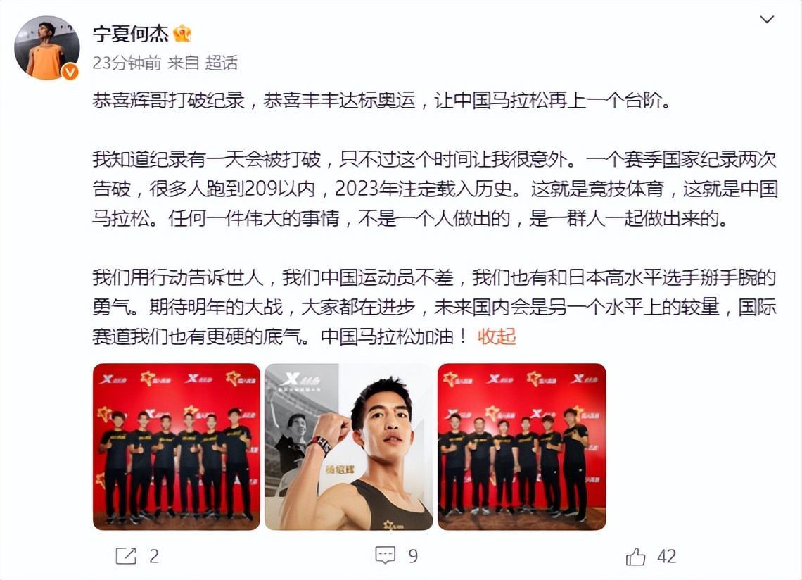 何傑表示:“恭喜輝哥打破紀錄,讓中國馬拉松再上一個臺階,我知道紀錄有一天會被打破,只不過這個時間讓我很意外,一個賽季國家紀錄兩次告破,2023年註定載入歷史。這就是競技體育,這就是中國馬拉松。”