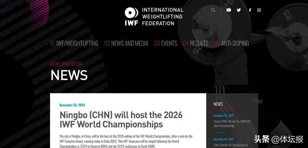 北京時間12月3日晚,在卡塔爾首都多哈舉行的國際舉重聯合會(以下簡稱國際舉聯)執委會上,寧波突破重圍,最終獲得2026年世界舉重錦標賽舉辦權。這是世界舉重錦標賽1995年在廣州舉辦之後,時隔28年再度落戶中國。