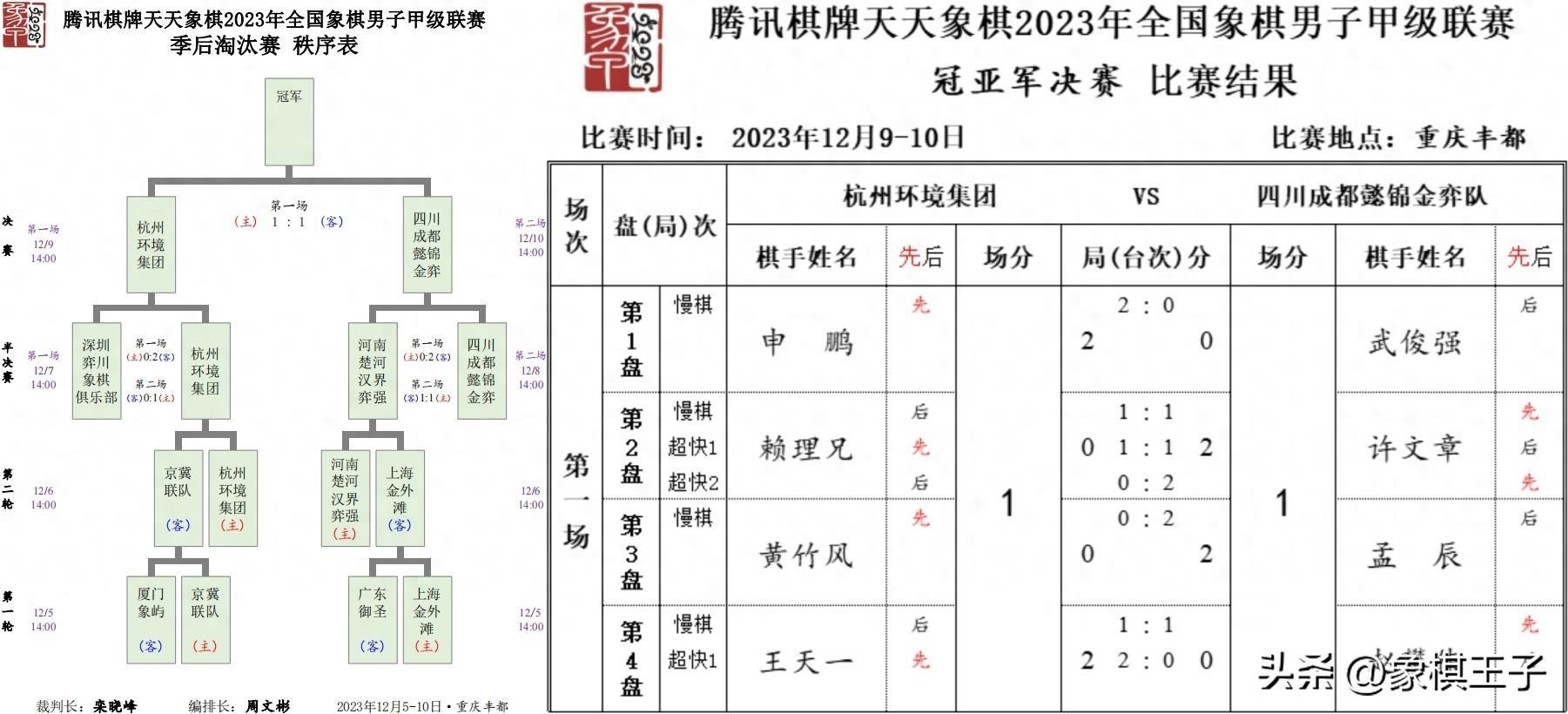 2023棋壇的超級盛宴,年終十二月巔峯大戲,象甲季後賽的對決,冠軍總決賽首場,棋壇第一高手王天一在全隊2比4落後情況下,強勢勝出,力保金身,杭州打平四川。