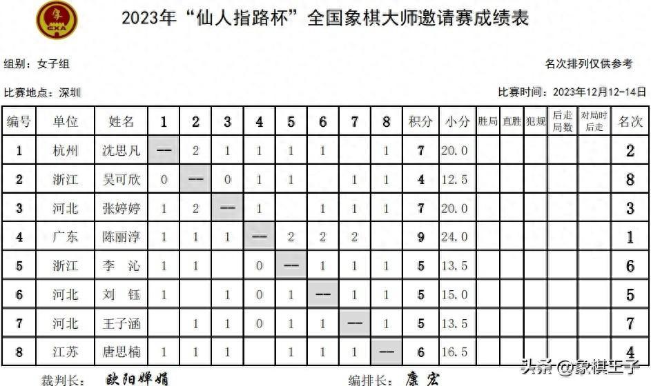 陳麗淳在前六戰中積9分高居第一,領先第二2分一個勝場,離登頂一步之遙,沈思凡、張婷婷7分,唐思楠6,劉鈺、王子涵、李沁5,吳可欣4。