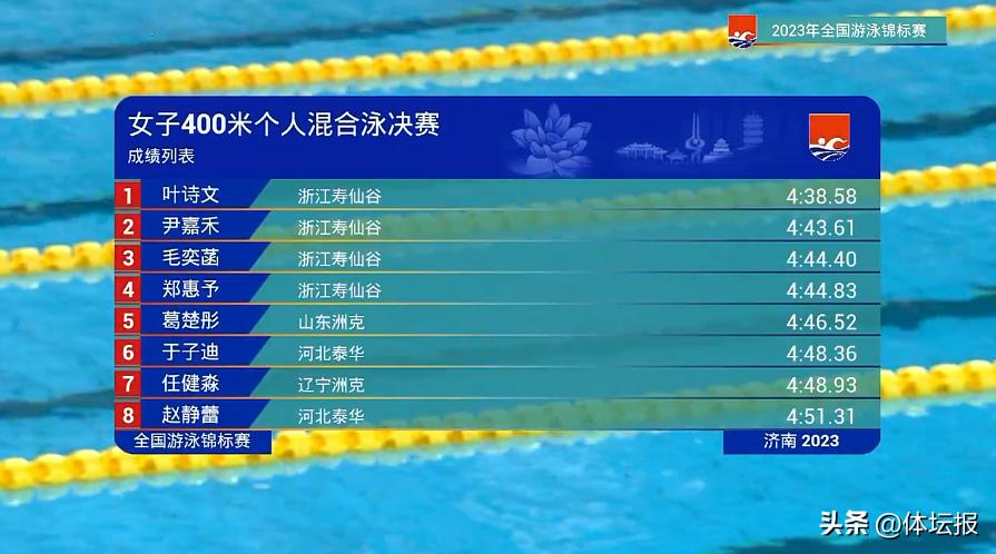 與她通場競技的另外7位選手,均爲“00後”,包括同樣來自浙江的尹嘉禾、毛奕菡、鄭惠予,分別獲得二、三、四名。而與她隔道較量的是河北選手於子迪,出生於2012年,正是葉詩文奧運奪冠那年。對於400混項目上陸續湧現潛力股,葉詩文喜聞樂見。