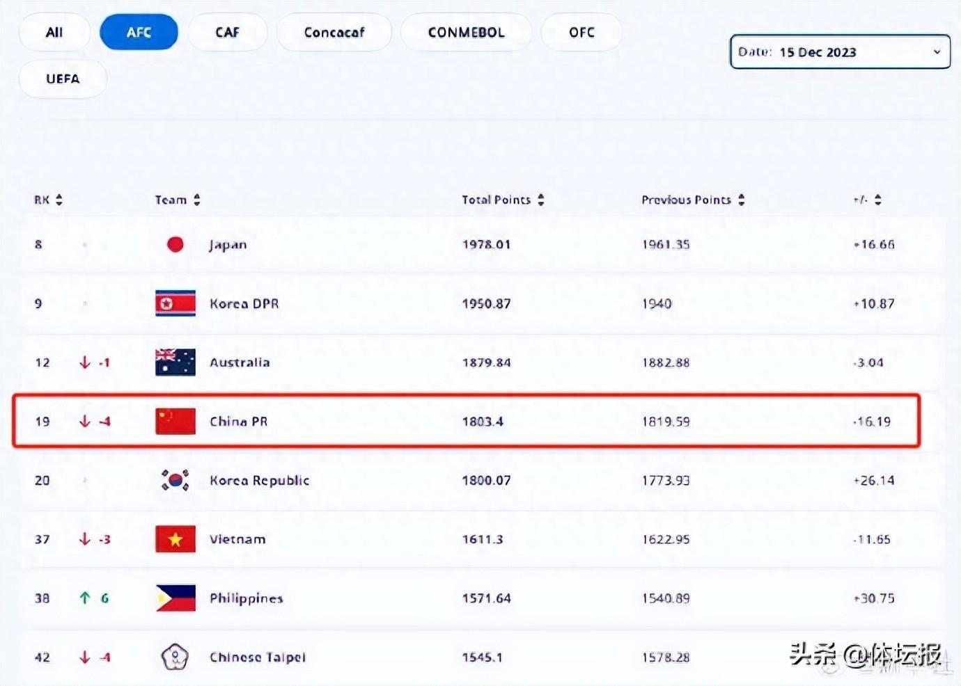 國際足聯15日公佈了最新一期女足國家隊世界排名,今年遭遇多項大賽失利的中國女足排名下滑至第19位,追平球隊歷史最低排名。新科女足世界盃冠軍西班牙隊高居榜首,美國女足位列次席。