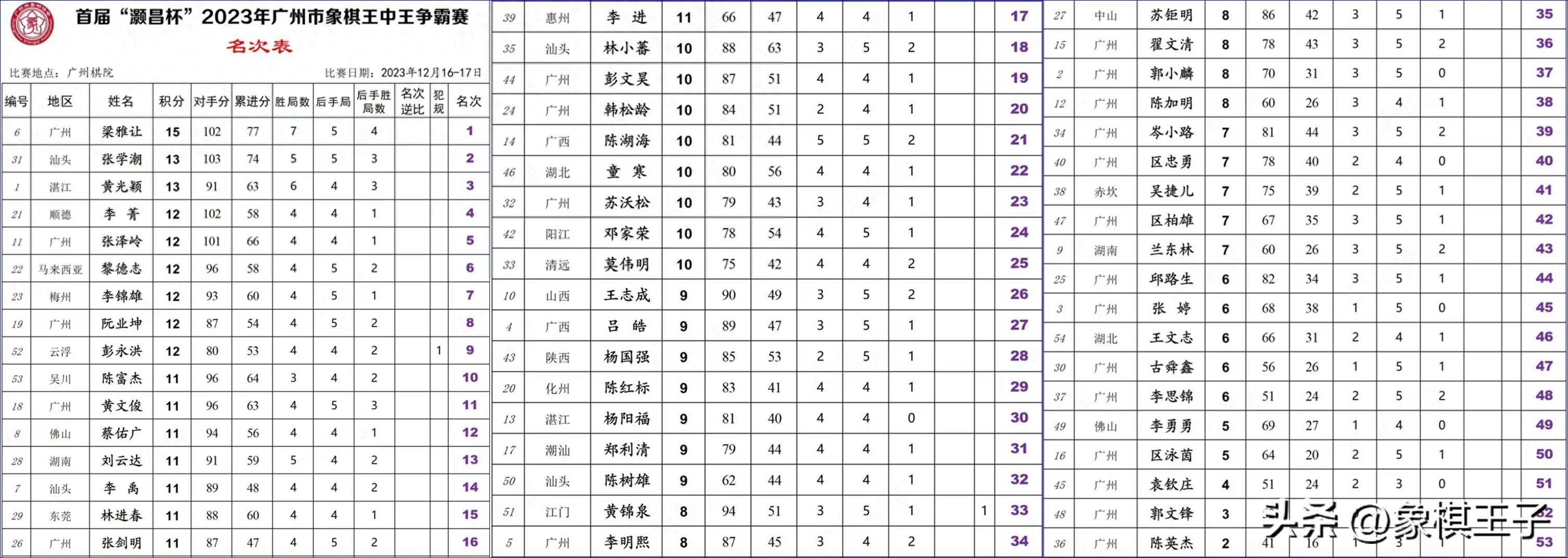 粵軍賽季兩大象甲主力,張學潮特大、黃光穎大師,同爲13分,比較小分,張學潮第二、黃光穎第三。
