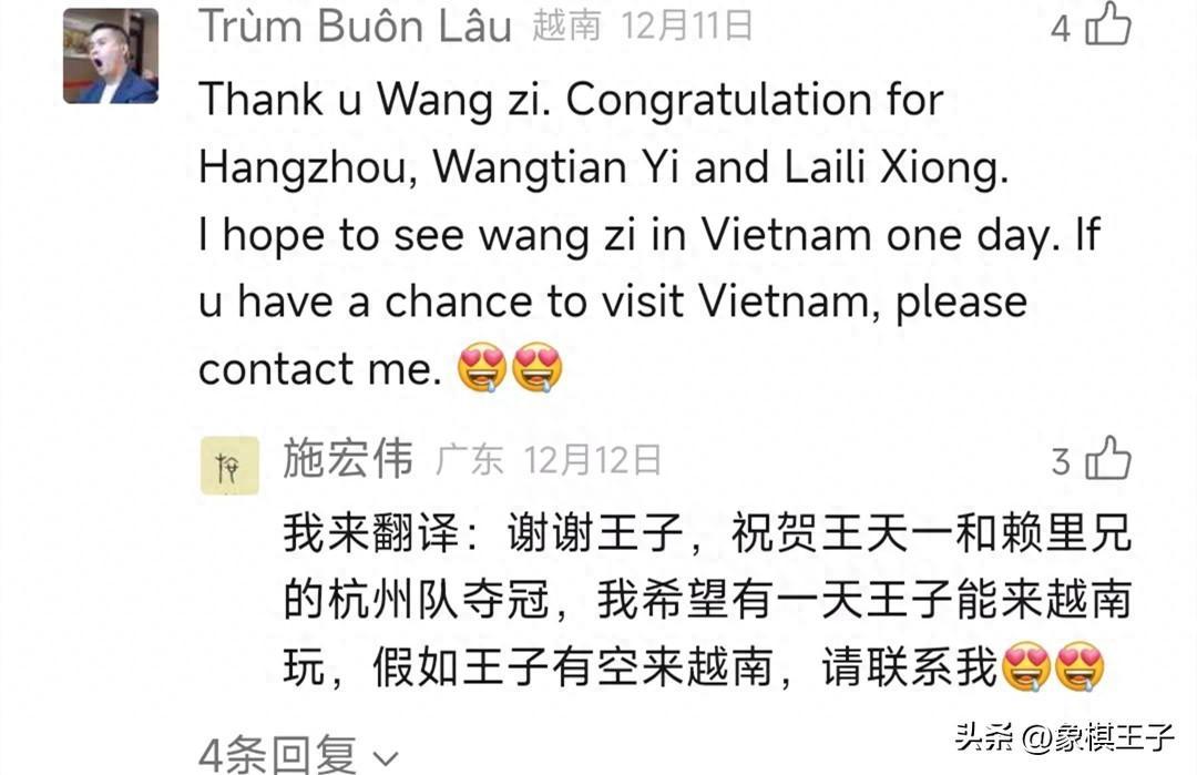 棋迷施宏偉翻譯:謝謝王子,祝賀王天一和賴理兄的杭州隊奪冠,我希望有一天王子能來越南玩,假如王子有空來越南,請聯繫我。