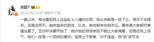 作爲當事人,武磊在社交媒體上深夜發文,親自闢謠。他表示,對於這種謠言,自己向來一笑置之,但最近竟然有很多朋友也開始問他這個謠言,看來穿得很離譜,所以他出來澄清。並強調國足是一個團結的集體。他寫道:“謠言止於智者,對於造謠,我‘武’話可說。”同時,他表示在亞洲盃即將開賽之際,國足需要團結一心,共同面對挑戰。