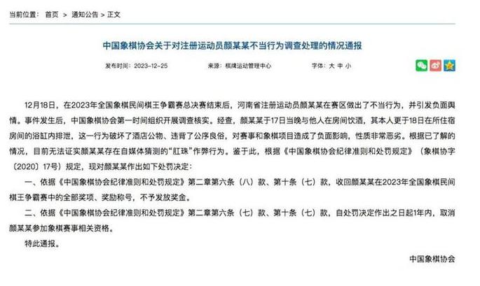近期,關於全國象棋民間棋王顏成龍奪冠後的“浴缸門”風波,鬧的是沸沸揚揚,目前官方已經發布公告,顏成龍因爲在浴缸內排便的不文明行爲,被禁賽一年,且收回其冠軍榮譽和全部獎金。據悉,這次比賽奪冠爲顏成龍帶來了10萬元人民幣的收益,結果還沒捂熱乎,錢就沒了,實在可笑!