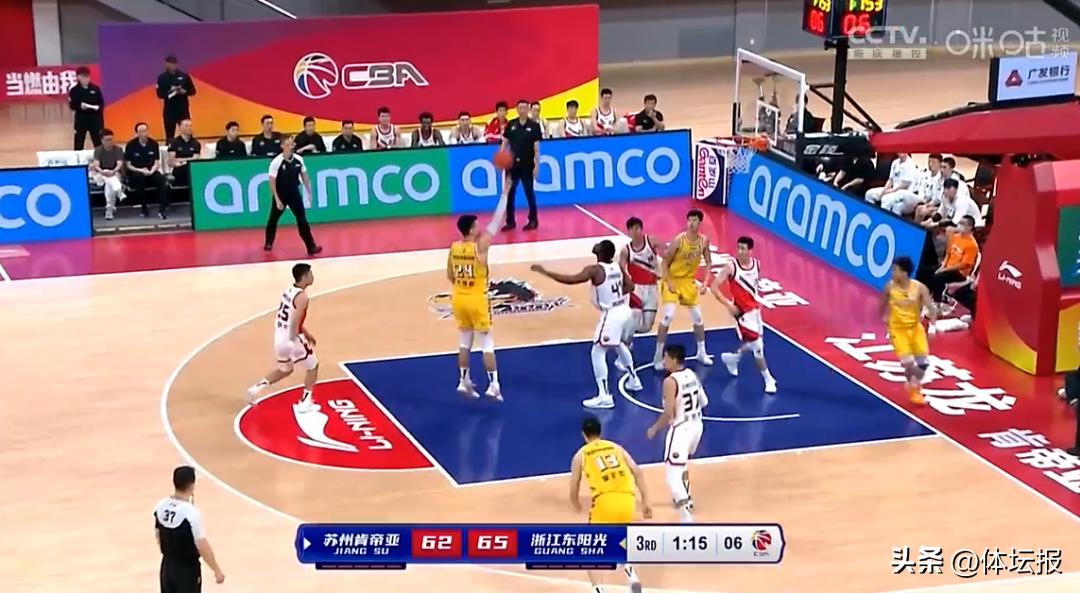 下半場伊始,許鍾豪率先打成2+1,孫銘徽搶斷布萊克尼後上空籃得手。在東陽光連續的衝擊之下,江蘇隊顯得有些難以招架,打了三分多鐘全隊就已犯滿。不過,雙外援的加持還是讓分差維持在個位數,江蘇隊靠着罰球不斷追分。