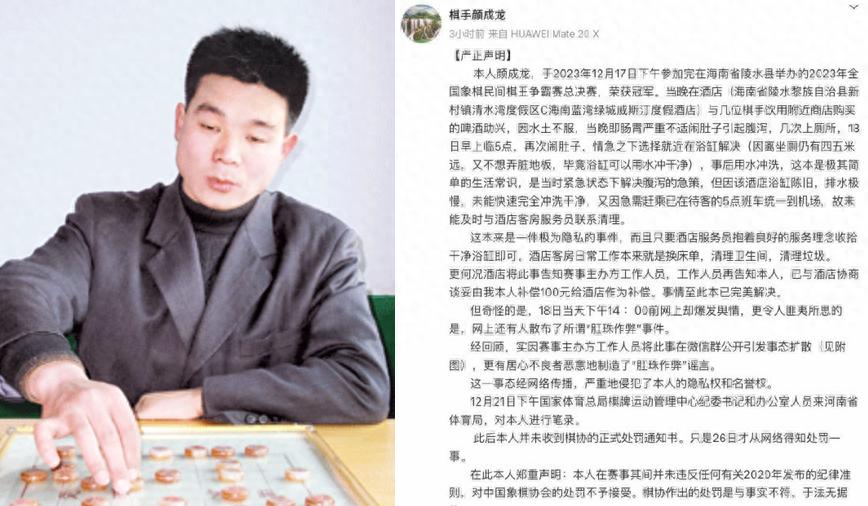 棋手顏成龍也再度發聲,強調“肛珠作弊”是有人惡意造謠,自己根本沒有參與,也不知道這個事情,至於浴缸排便,是因腹瀉情急纔不得已爲之,事後他也有補償100元給酒店。