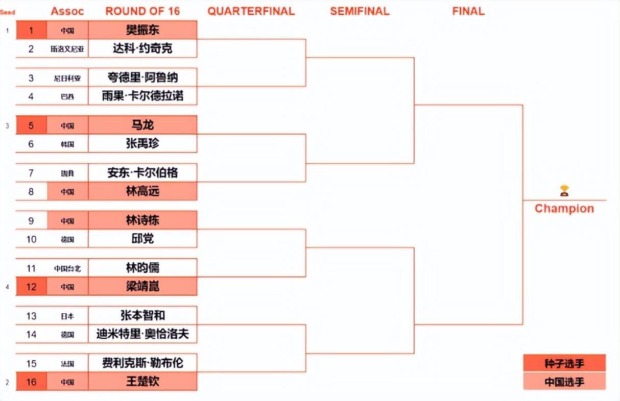 最後的半區分組,張本智和大戰奧恰洛夫,王楚欽對陣菲利克斯。張本智和勝在年輕,但他的問題也在於不穩定的心態,相比之下,奧恰洛夫隨着年齡逐漸增大,雖然競爭力和體能有所下滑,但關鍵分上肯定比張本智和更能咬住。