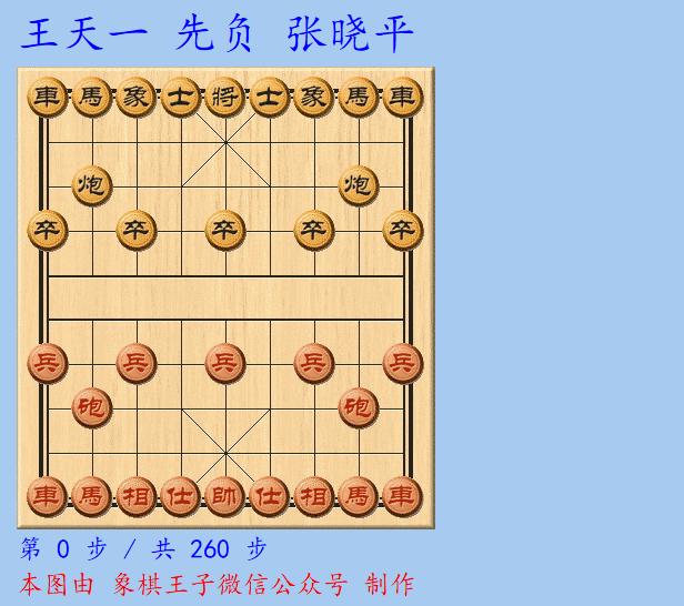 是戰,王天一執先,擺下了仙人指路陣,張曉平應以對挺卒,佈局紅方兵底炮,黑方進左邊馬。
