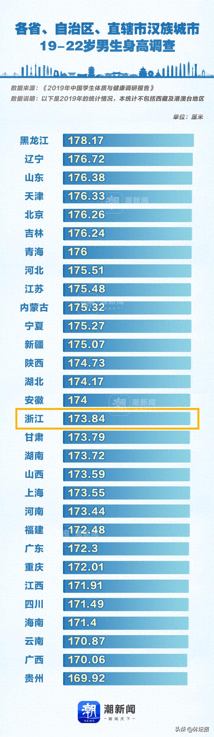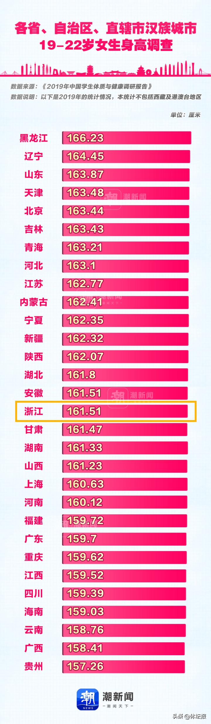 根據2022年出版的《2019年中國學生體質與健康調研報告》顯示:19—22歲男生中,黑龍江省以178.17釐米的平均身高位居榜首,浙江以173.84釐米排名16名。而女生中,黑龍江省以166.23釐米的平均身高位居榜首,浙江則以161.51釐米排名16名。如果從排名上看,南北方身高之差,並沒有想象中的那麼大。