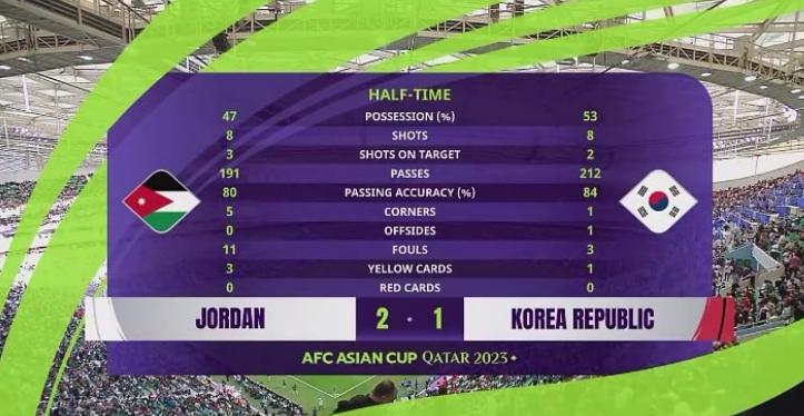 本以爲取得夢幻開局之後,韓國隊會一路開啓進球模式,誰曾經,頑強的約旦很快便扳平了比分,比賽第37分鐘,約旦開出角球,韓國中場樸鎔宇頭球頂偏,鑽進連自家球門,韓國1比1遭約旦追平比分,而在上半場即將結束的時候,約旦再進一球,來自奈馬特的禁區外凌空遠射,石破天驚,非常漂亮,約旦從落後到反超,全隊瘋狂慶祝。