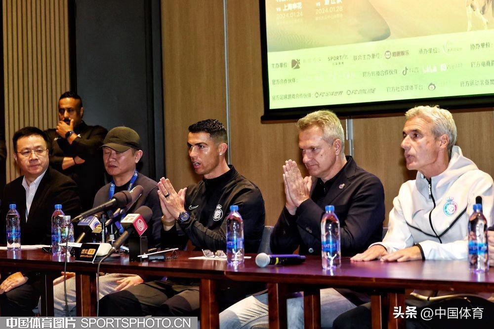 中國體育訊 1月23日晚,利雅得勝利2024中國行主辦方召開新聞發佈會,宣佈出於C羅個人身體原因,利雅得勝利中國行兩場比賽全部延期。C羅於1月21日隨沙特職業聯賽俱樂部利雅得勝利乘專機抵達深圳,按計劃他們將分別於1月24日和1月28日在深圳大運中心體育場對陣中超俱樂部上海申花和浙江隊。(中國體育圖片 安靈均 鹿麟 攝)