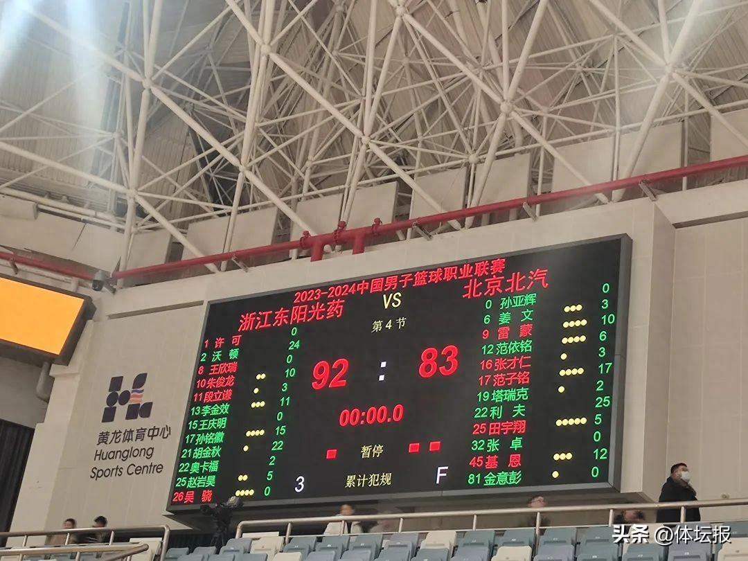 1月24日,浙江東陽光藥回到主場,本賽季第三次對陣北京北汽。最終,東陽光藥以92:83力克對手,取得四連勝。此役,東陽光藥五人得分上雙,沃頓收穫24分10助攻的兩雙,胡金秋砍下22分12籃板;北京四人得分上雙,利夫拿下全場最高的25分。