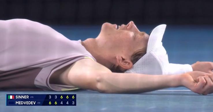 在0比2落後之後,辛納開啓了絕地反擊模式,連扳兩盤,並且再一次盤末破發,意大利人以6比4拿下第四盤,總比分追成2比2,雙方進入了殘酷的決勝盤,也是冠軍點的較量。彼時的辛納勢頭回升,梅德韋傑夫有點招架不住了。