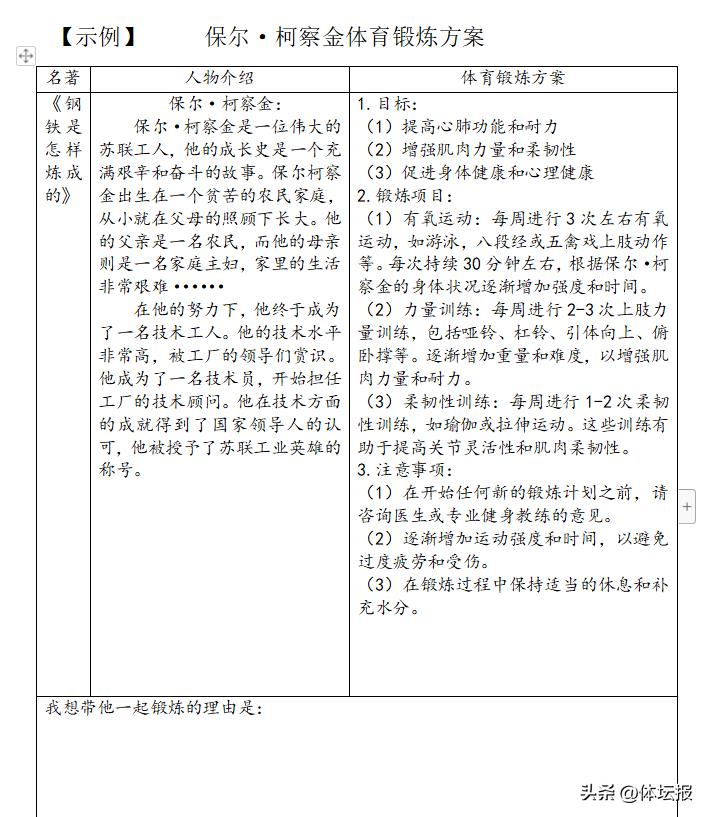 杭州市文溪中學則推出了“體育+語文”的跨學科寒假作業,同學們可從任意名著(如《鋼鐵是怎樣煉成的》《名人傳》《平凡的世界》等)中選擇一位人物,依據原著內容,考慮人物的年齡、身體狀況,爲他們量身定製一套新年體育鍛煉計劃,跟着計劃內容一起“雲鍛鍊”。