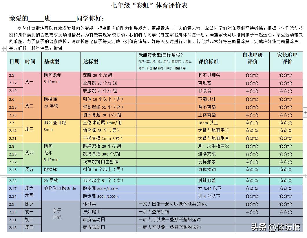 杭州四季青中學精心制定了寒假體鍛計劃及“彩虹”體育評價表,表上羅列着基礎型、達標型和興趣特長型等各式各樣運動,一週七天不重樣。在除夕、春節等特殊的日子還設置了“親子時光”,項目沒有限定,但需要一家人一起動起來。例如在大年初一,全家可以一起登高祈福,進行一些有年味的體育活動。這份“體育+親子”的作業旨在倡導親子共同運動,打造“運動家庭”。