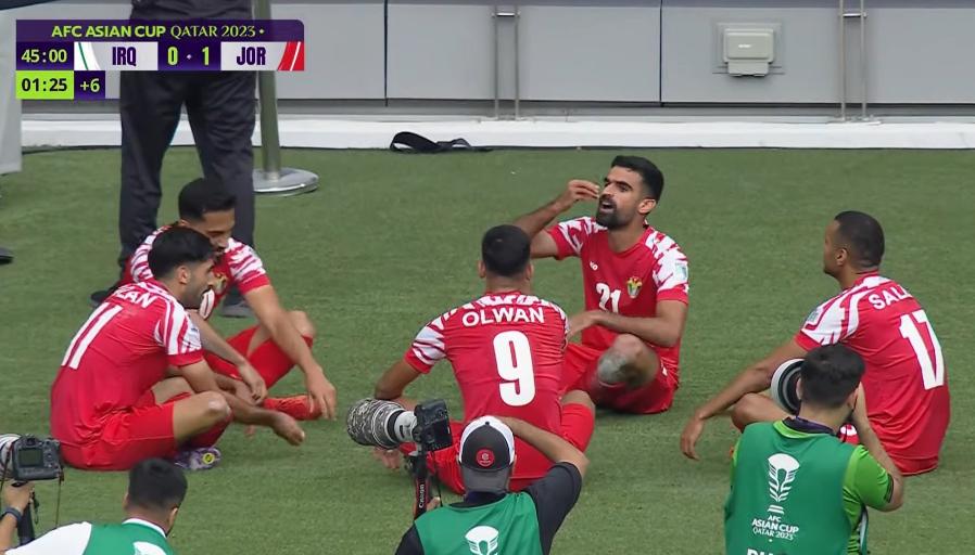 半場補時階段,伊拉克後衛犯大錯,中圈位置一腳盲目橫傳球,被約旦前鋒雅贊前搶攔截,隨後加速單刀,長驅直入,面對門將賈拉爾-哈桑挑射入網,1比0,場上平衡局面被打破了。