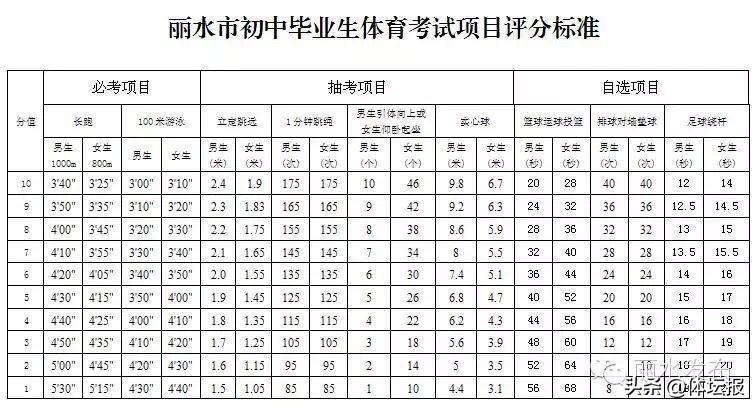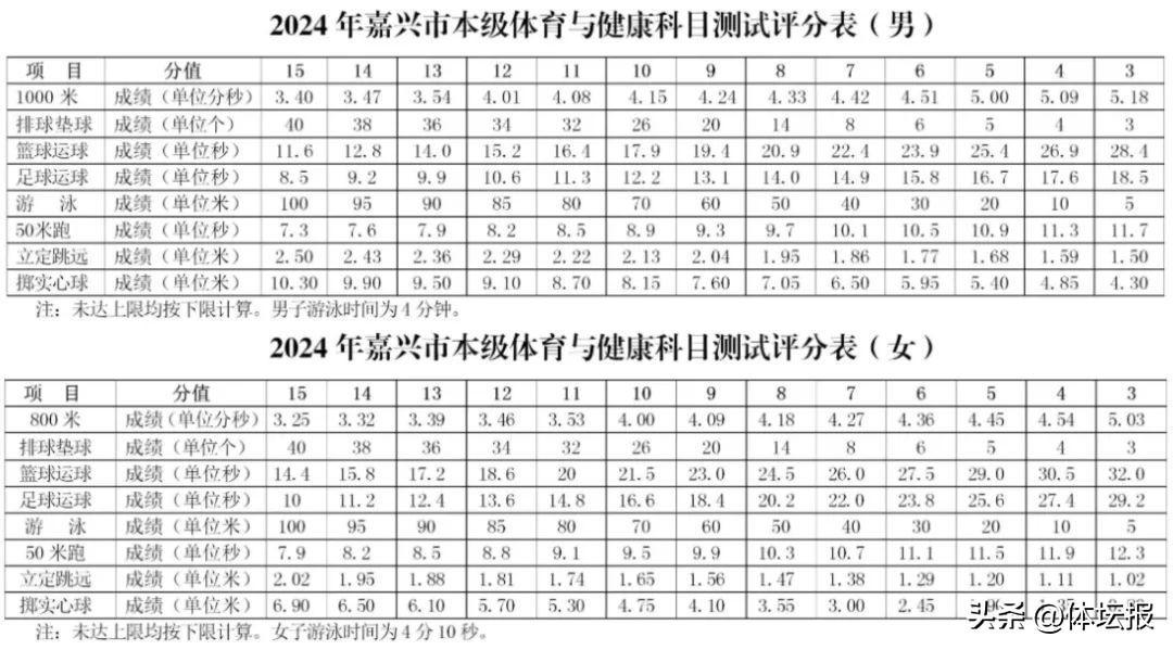 據瞭解,今年紹興“體育與健康”分值40分,考試項目、分值、標準和組考主體等與2022年保持一致,首考原則上在5月中旬前完成;麗水總分30分,恢復爲必考、抽考、選考三個大項,考生在每個大項中各選一種體育項目參加考試;嘉興滿分30分,每位考生須在立定跳遠、50米跑、雙手頭上前擲實心球、籃球運球、足球運球、排球墊球、游泳、1000米(男)/800米(女)等8個項目中自主選擇2項作爲測試項目,每項15分。