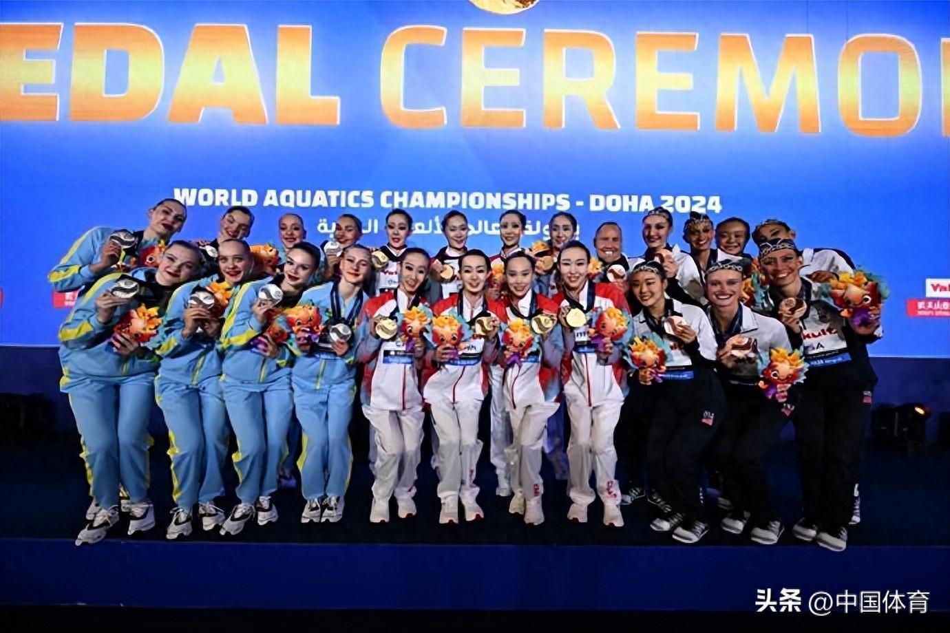 花樣游泳集體技巧自選頒獎儀式(圖片來源:世界泳聯官網)中國體育訊 北京時間2月4日,在2024年多哈游泳世錦賽花樣游泳集體技巧自選決賽中,由常昊、馮雨、王賜月、王柳懿、王芊懿、向玢璇、肖雁寧、張雅怡組成的中國隊以244.1767分贏得金牌。這是中國隊在本屆世錦賽花樣游泳項目上收穫的第一枚金牌。烏克蘭隊以243.3167分獲得銀牌,美國隊以242.2300分獲得銅牌。(完)
