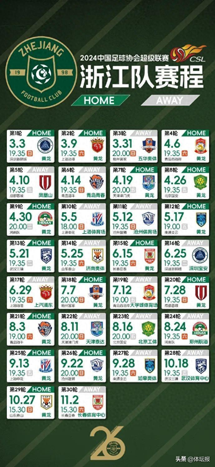 2月8日中國足協發佈了2024中超聯賽對陣日程表新賽季將於3月1日開幕11月2日結束。根據中國足協發佈的賽程,新賽季中超聯賽共有16支隊伍參加,將進行30輪240場比賽。3月1日進行的首場比賽由青島西海岸對陣河南俱樂部,當日進行的還有上海海港與武漢三鎮的焦點戰。浙江隊賽程如下↓↓↓新徵程一起在黃龍爲浙江加油!附:完整賽程表來源:新華網、浙江FC官微