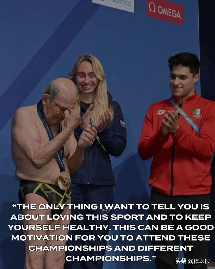 在爲全世界觀衆奉獻了一米臺跳水後,這位百歲老者從世界泳聯主席手中接過了金牌。