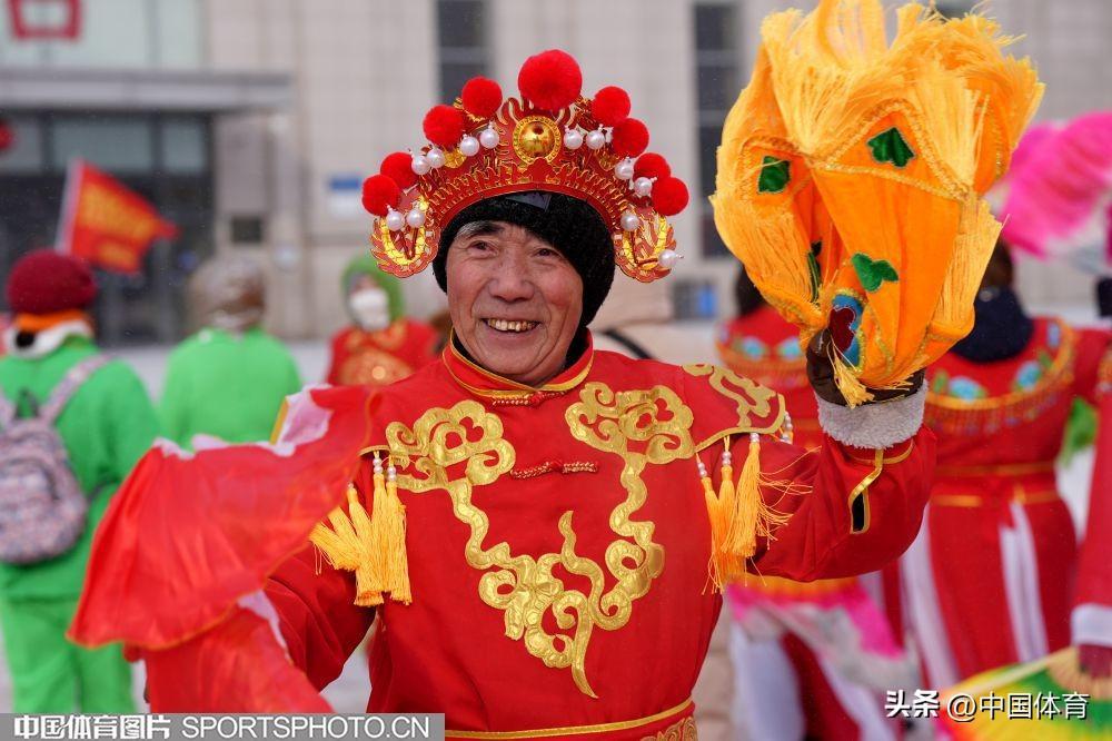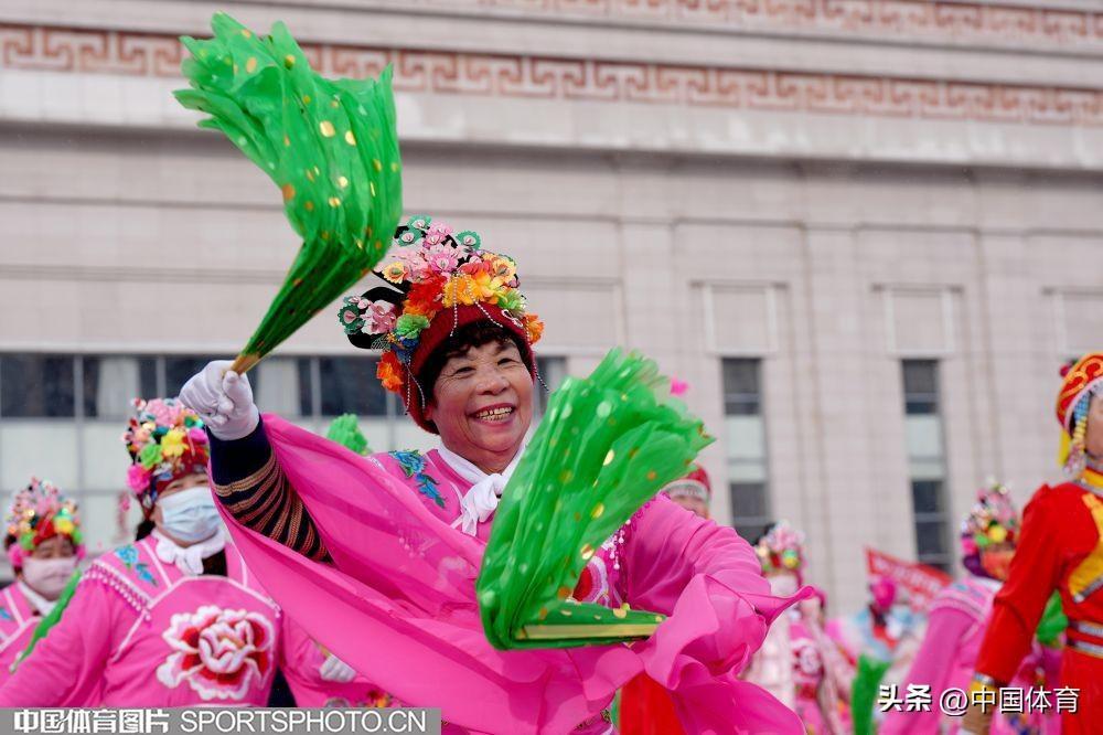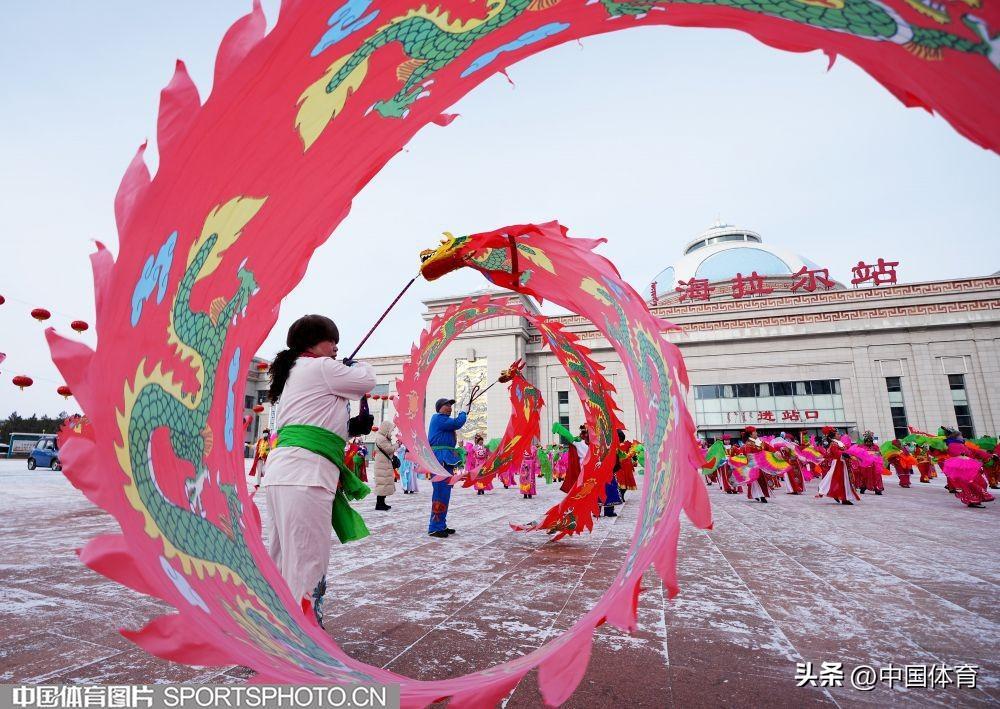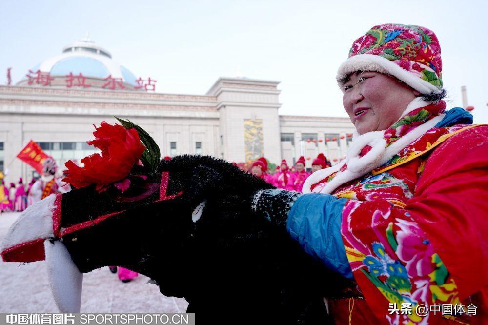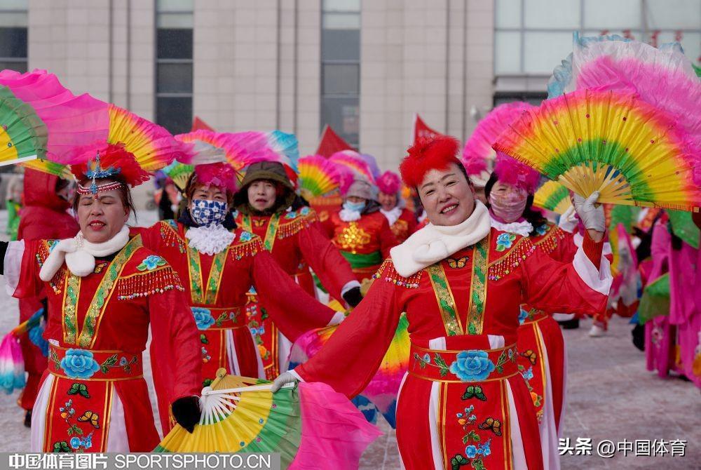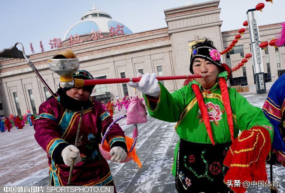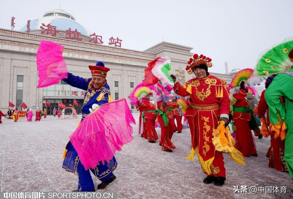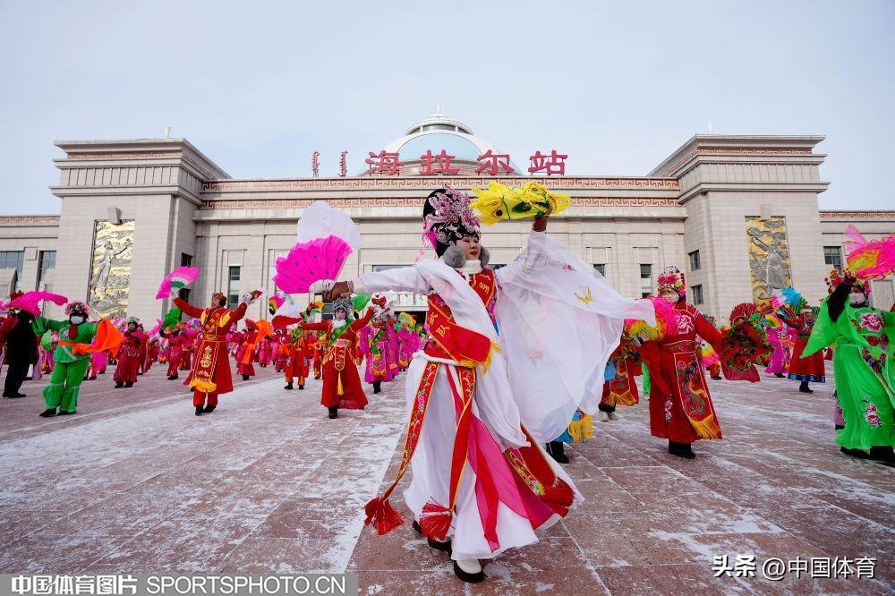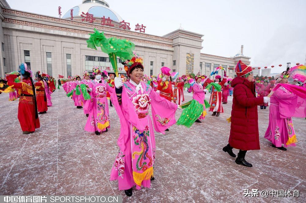 中國體育訊 2月19日,第十四屆全國冬季運動會在內蒙古如火如荼地進行。呼倫貝爾市海拉爾區老體協在海拉爾站前廣場組織全民健身大拜年活動,400名中老年健身愛好者用火紅的秧歌迎接“十四冬”。圖爲秧歌表演。(中國體育圖片 倪敏哲 攝)