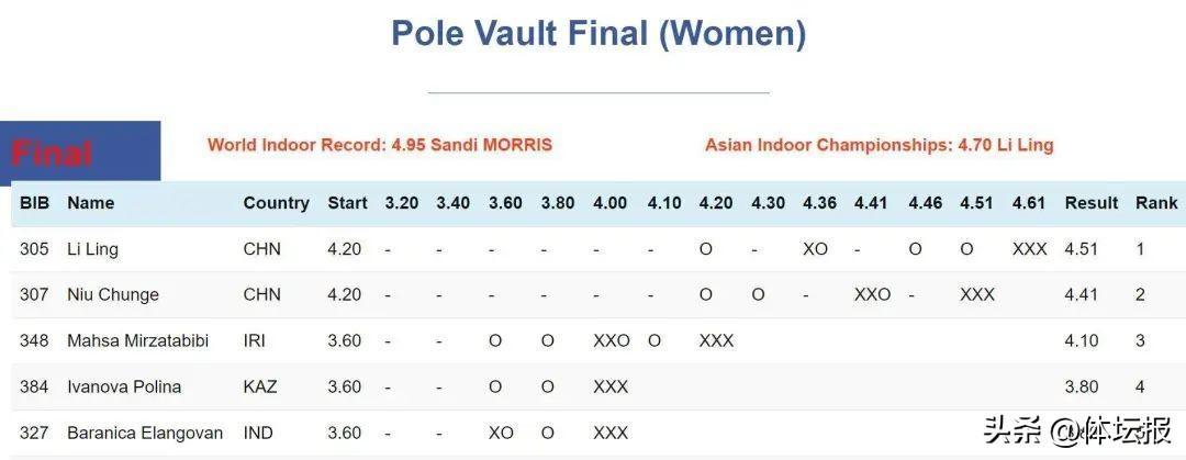 當地時間2月19日,爲期三天的第11屆亞洲室內田徑錦標賽在伊朗德黑蘭落幕。中國田徑隊最終以8金6銀2銅位列獎牌榜第一。其中,浙江撐竿跳高名將李玲在最後一個比賽日登場亮相,以4米51的成績奪得女子撐竿跳高冠軍,也贏了她今年的首個冠軍。