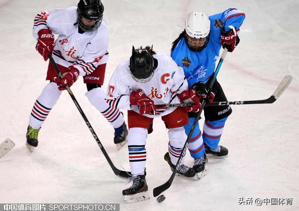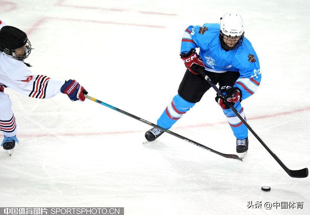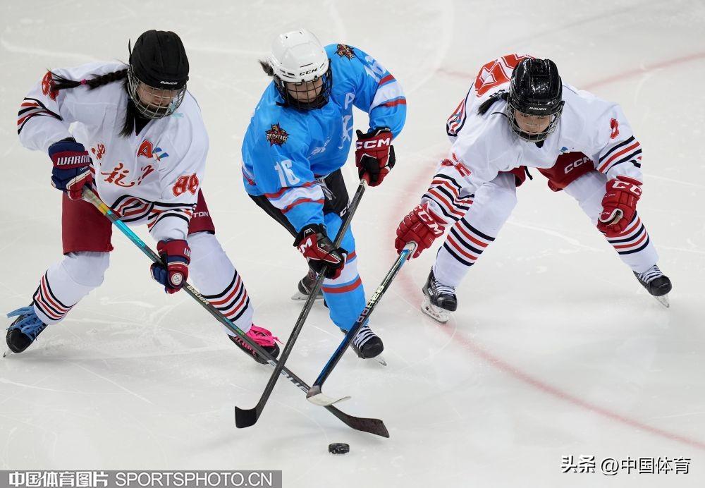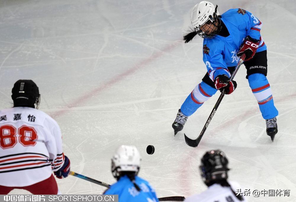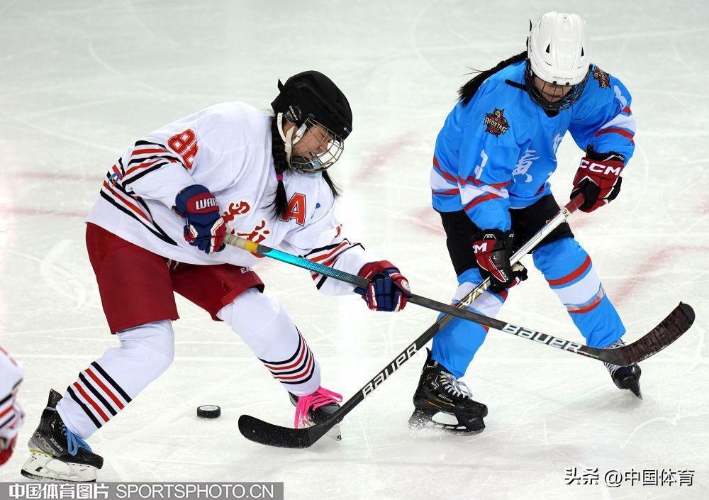 中國體育訊 2月24日,第十四屆全國冬季運動會青年組女子冰球排位賽,在內蒙古冰上運動訓練中心舉行。黑龍江隊(白衣)3比3戰平廣東隊(藍衣)。圖爲比賽場景。(中國體育圖片 倪敏哲 攝)