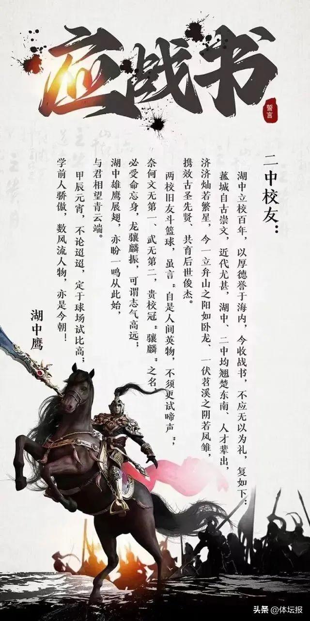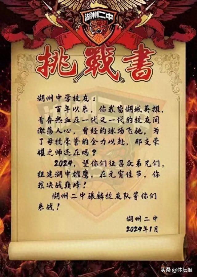 春節假期,不少湖州人的朋友圈都被一封挑戰書和一封應戰書刷屏了。湖州市第二中學向湖州中學發起挑戰,兩所學校將集結歷屆籃球隊校友,約定在元宵佳節進行“巔峯對決”。